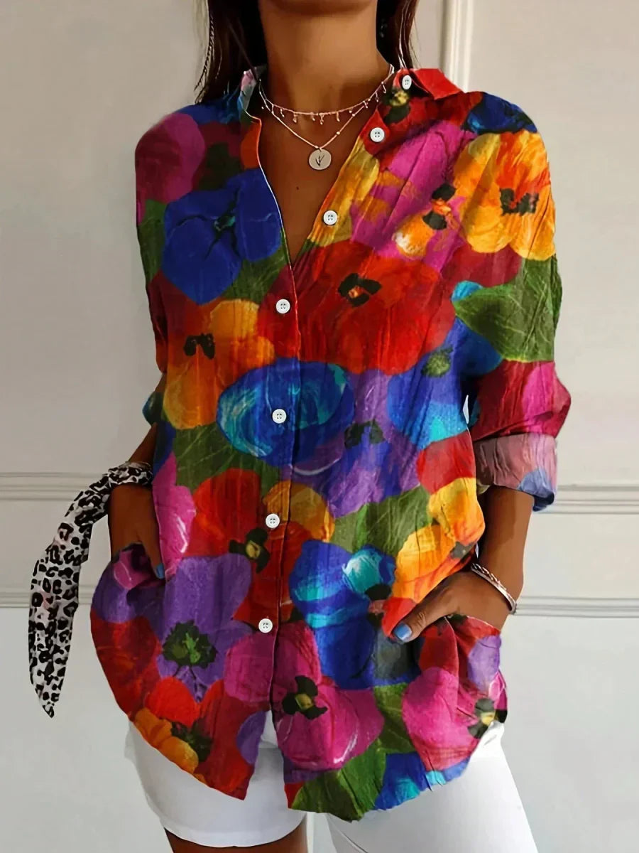 このブラウスは、リラックスしたシルエットに大胆な色と遊び心のあるパターンを取り入れています。ボタンアップの前面、軽やかな感触、長袖が特徴で、カジュアルな外出、バケーション、または日常のルックに明るいひねりを加えるのに最適な選択です。